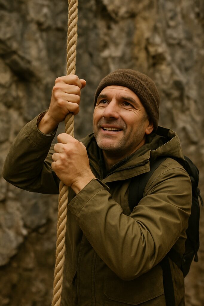 A realistic photo-style vertical portrait showing only a stranded human at the bottom of a steep cliff. The person is gripping a thick rope with both hands, holding tightly. Their expression shows determination and relief. They wear rugged, outdoorsy clothing suitable for mountain hiking. The rocky cliff wall fills the background. No cat is visible.