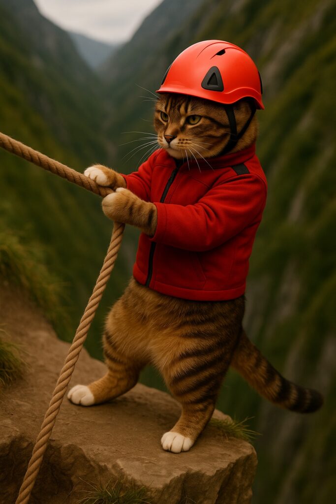 The cat, wearing a red rescue jacket and helmet, stands at the edge of a cliff and firmly lowers a rope downward, its expression serious and concentrated.