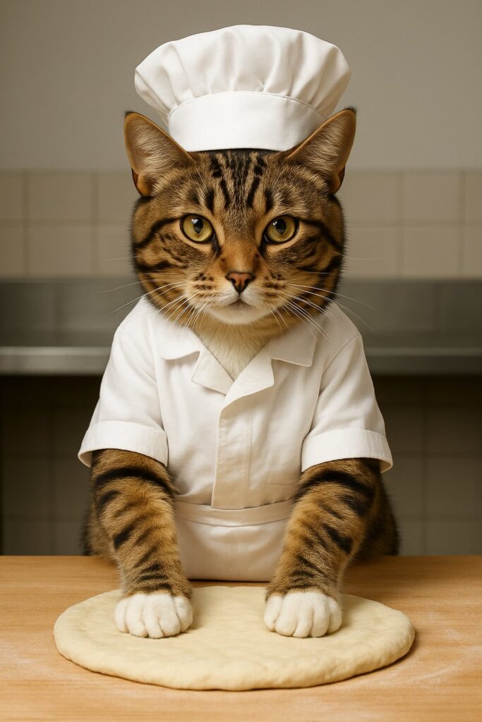 The cat is wearing a white chef’s hat, a white shirt, and an apron.