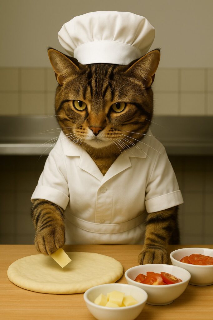 The cat, with a serious expression, picks up toppings like cheese or tomato with one paw and places them onto the pizza dough with the other paw.