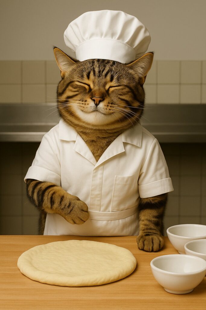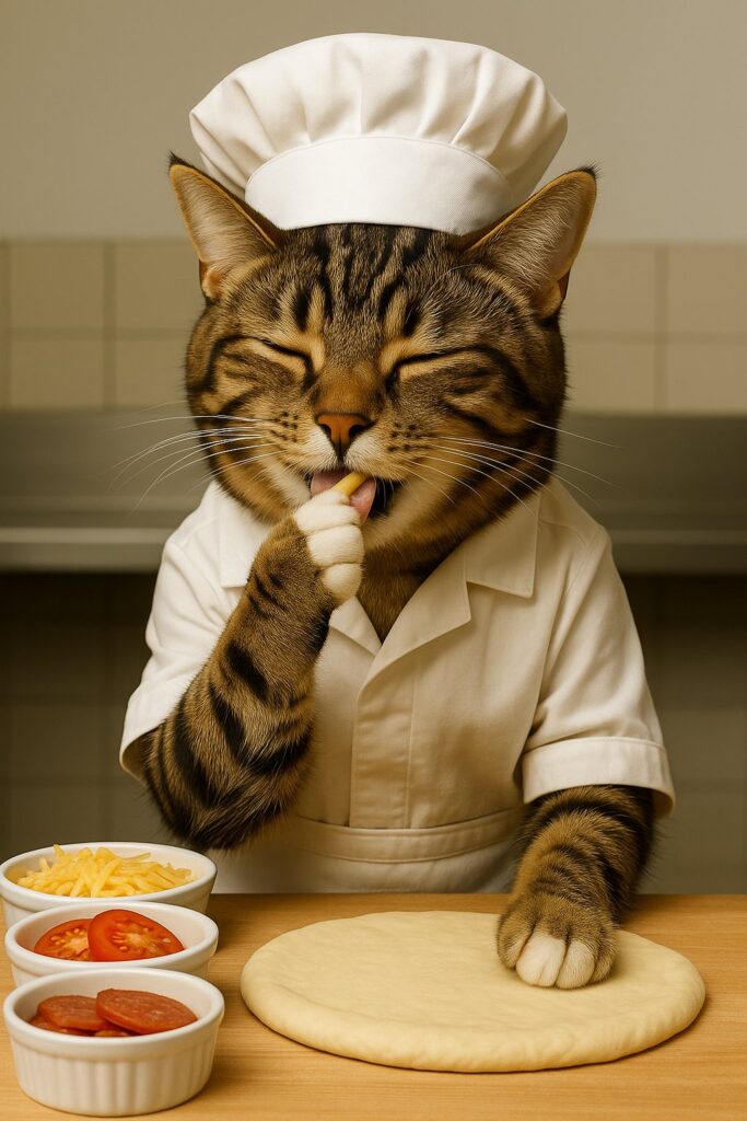 In the background, a human pizza chef stands with arms crossed, looking at the cat with an exasperated expression.