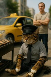 A bipedal cat with the same fur color and markings as the reference image.