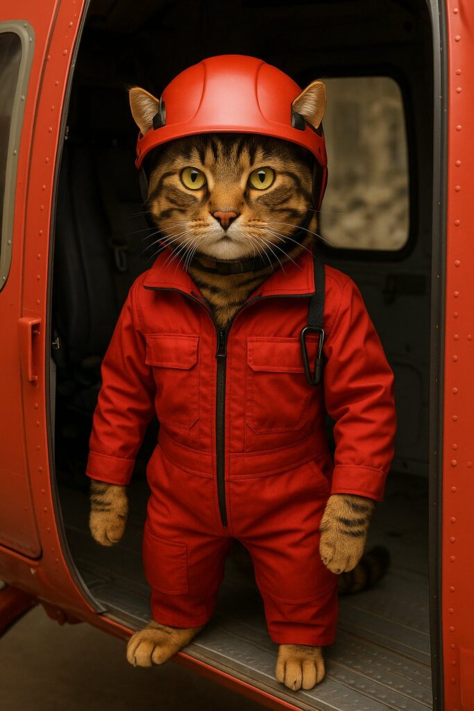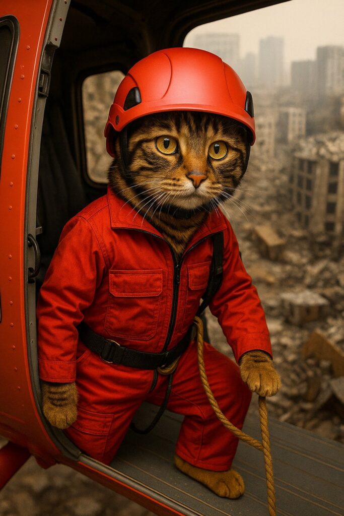 The cat stands at the rescue helicopter door with a serious expression, preparing to descend.