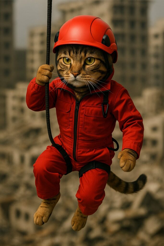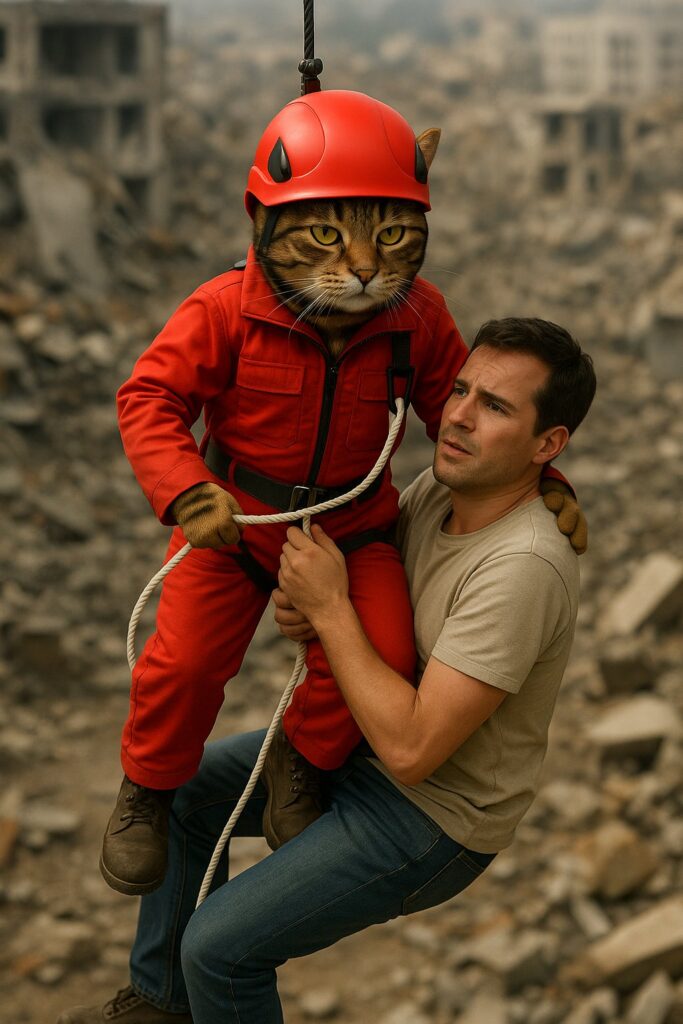The cat stands proudly beside them, wearing a red rescue jacket and a helmet.