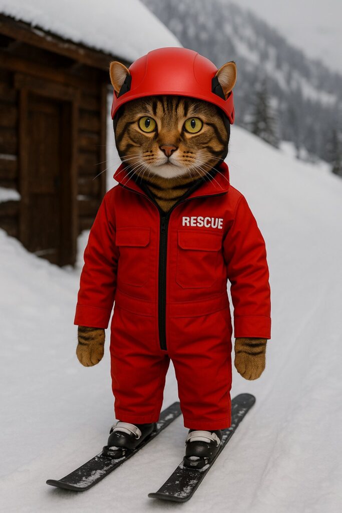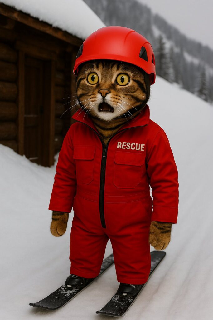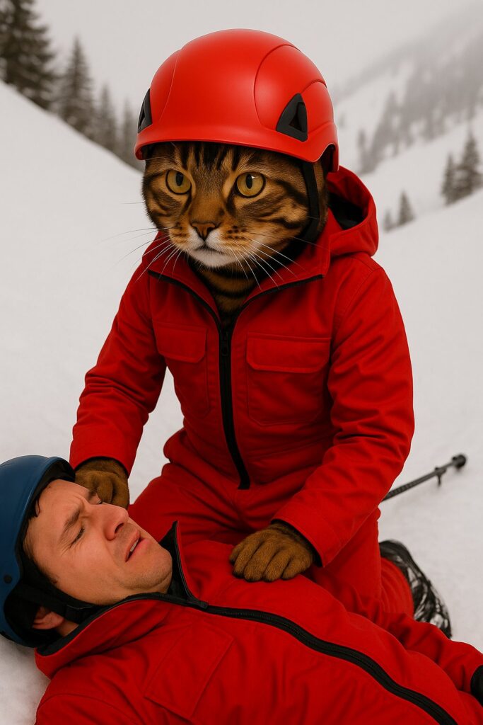 The cat kneels beside the fallen skier, checking their condition with a serious expression.