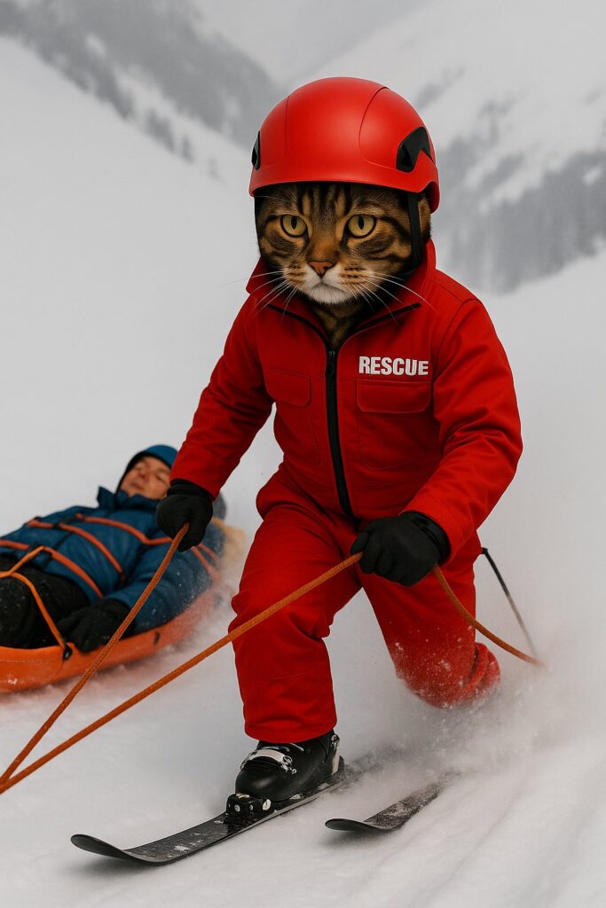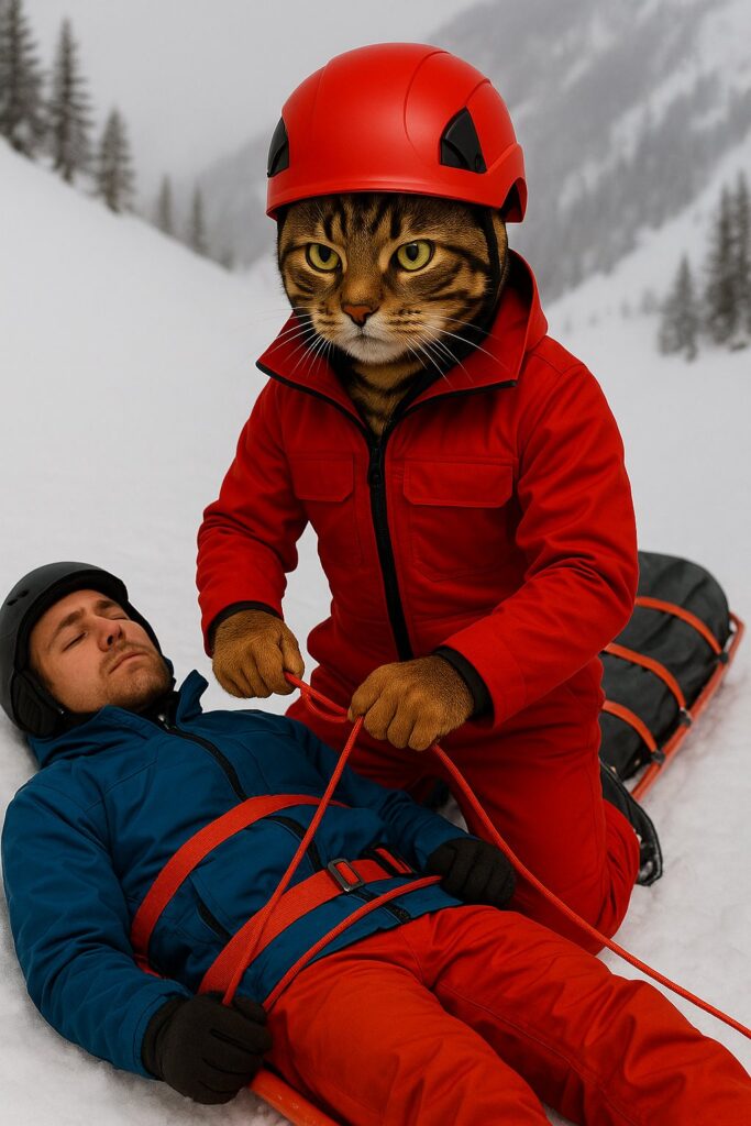 The cat secures the skier onto the rescue sled, tightening the ropes with a serious expression.
