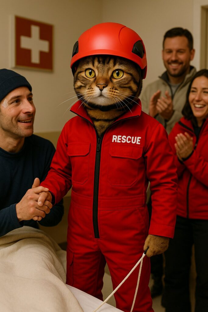 Inside the rescue station, the rescued skier thanks the cat while human staff applaud. The cat stands proudly with a confident expression.