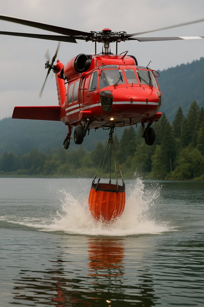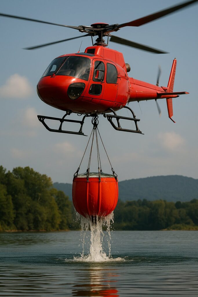 The red firefighting helicopter hovers above the lake, lowering the bucket into the water.