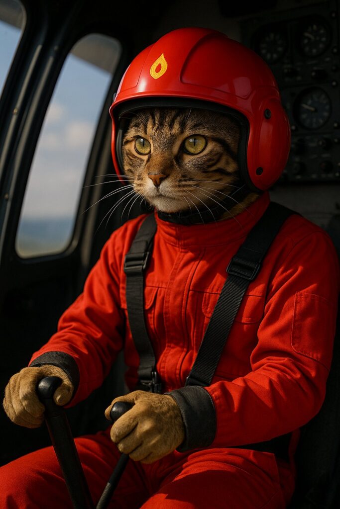 Through the cockpit window, a cat in a red pilot suit and helmet is visible, gripping the control stick and piloting with a serious expression.