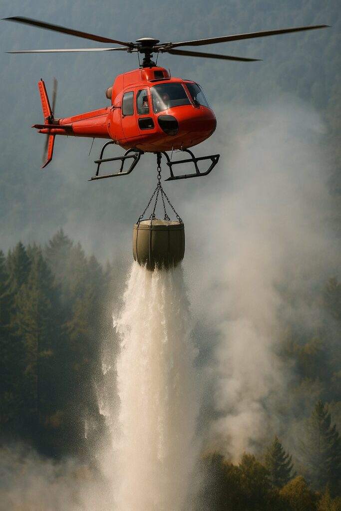The firefighting helicopter hovers, releasing a massive drop of water from the bucket.