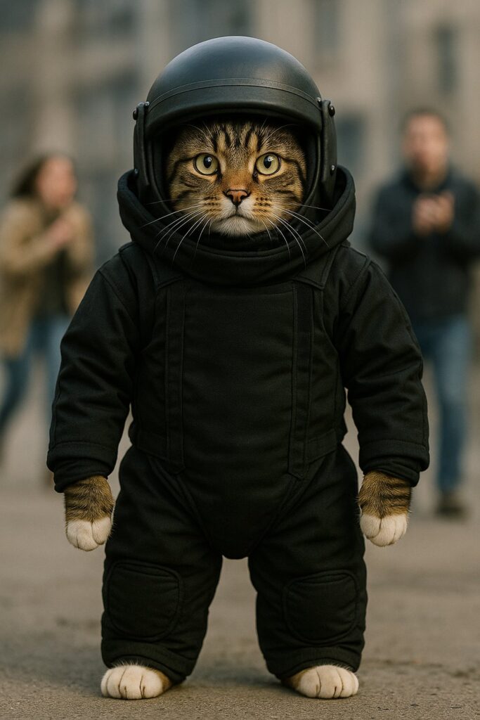 The same bipedal cat from Scenes 1–3, wearing a black bomb-disposal suit and helmet.