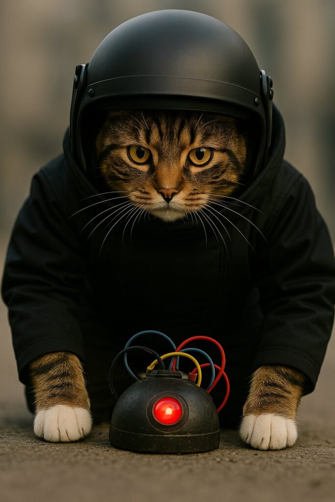 A bipedal cat in a black bomb-disposal suit and helmet examines a “bomb device” placed on the ground.
