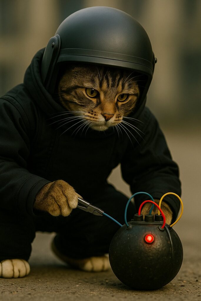 The cat holds a tool, carefully comparing the wires of the bomb device.