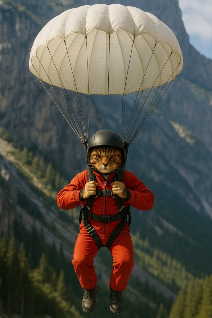 The cat jumps from high altitude and the parachute bursts open.