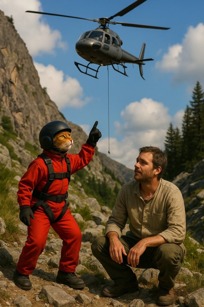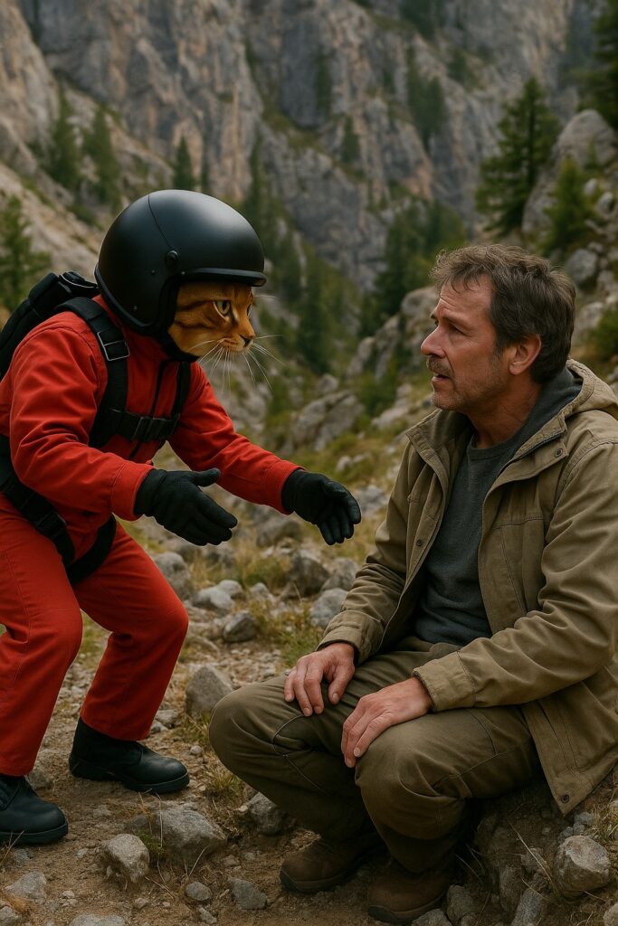 The cat is rushing toward a stranded person on a rocky mountain slope.