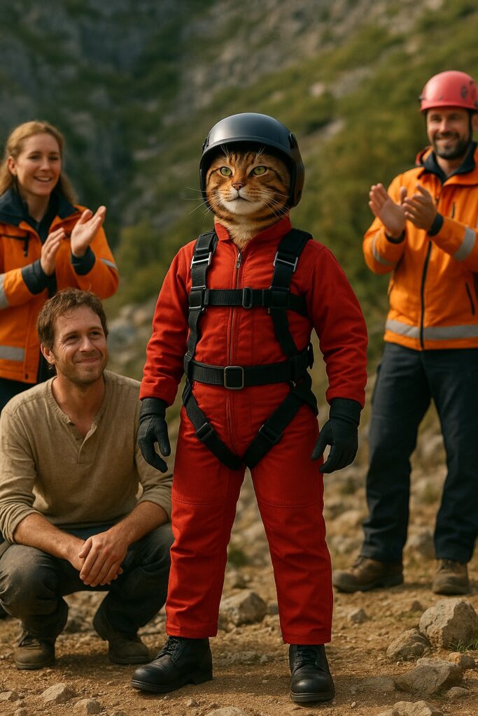 The stranded person sits with relief, while surrounding rescue team members clap to praise the cat.