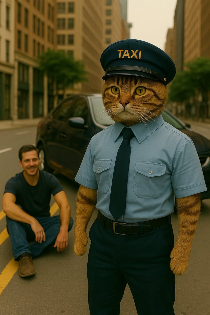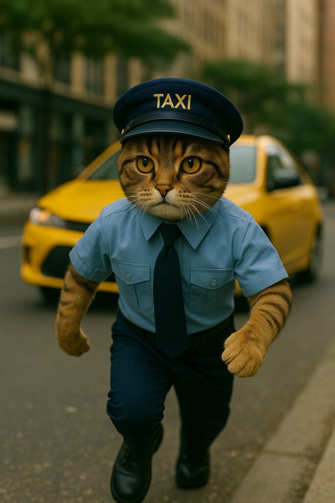 The cat wears a taxi driver’s uniform (short-sleeve shirt and driver cap).