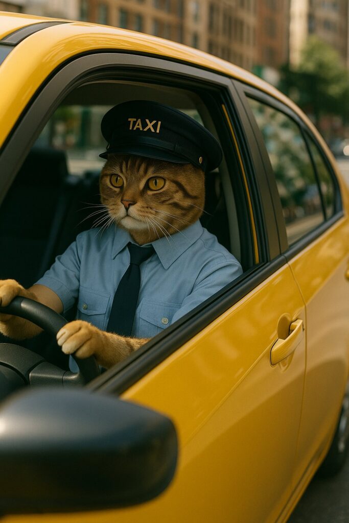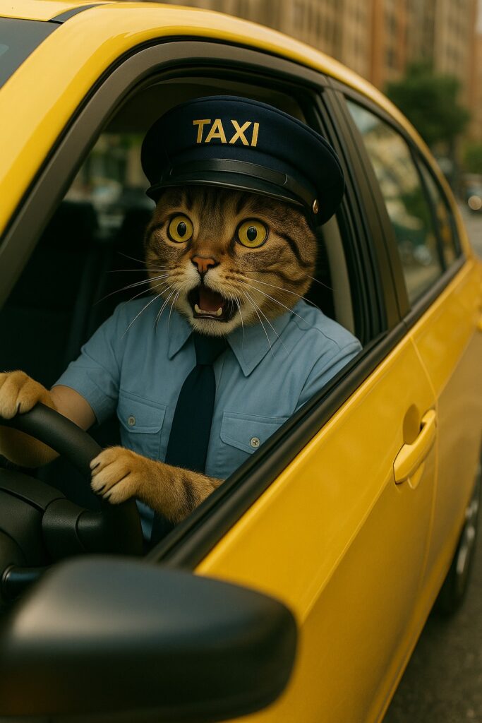 A cat sits in the taxi driver’s seat, looking forward with a surprised expression.
