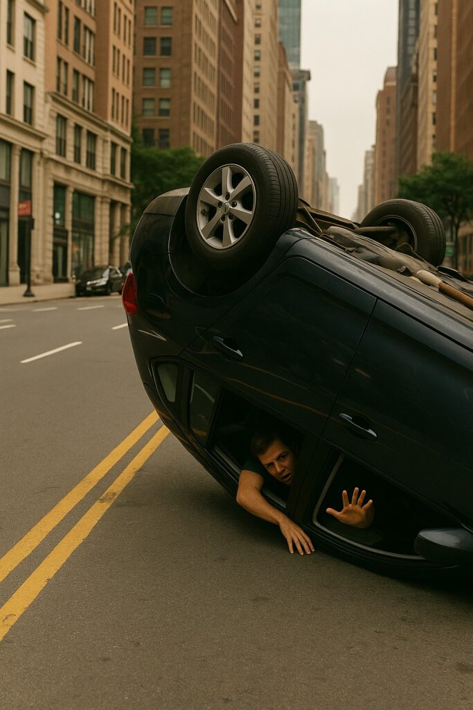 The overturned car is not shown.