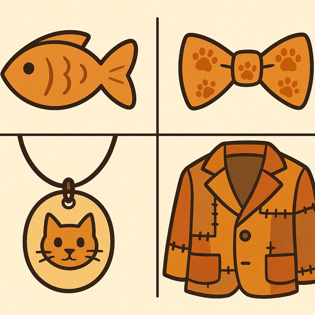 A patch with a fish logo, a bowtie with paw prints — small details create memorable characters.